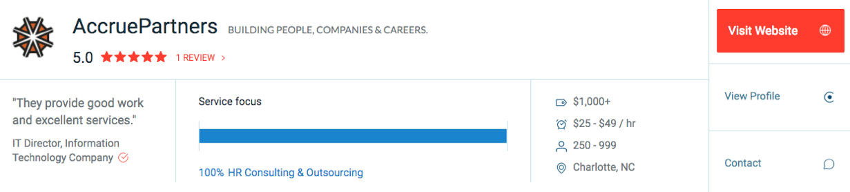 In response to our methods and persistence of unparalleled performance, AccruePartners was awarded a spot as a Clutch leader for staffing and recruiting services, out of the 50+ most highly reviewed firms for corresponding services. Clutch analysts thoroughly evaluated each company on their market presence and expertise, services offered, and ability to deliver exceptional results for their clients. AccruePartners achieved 3rd for top